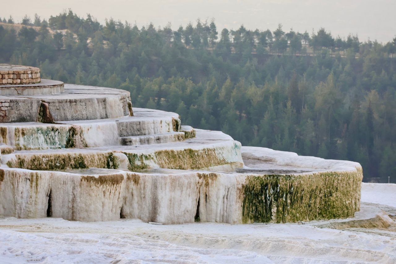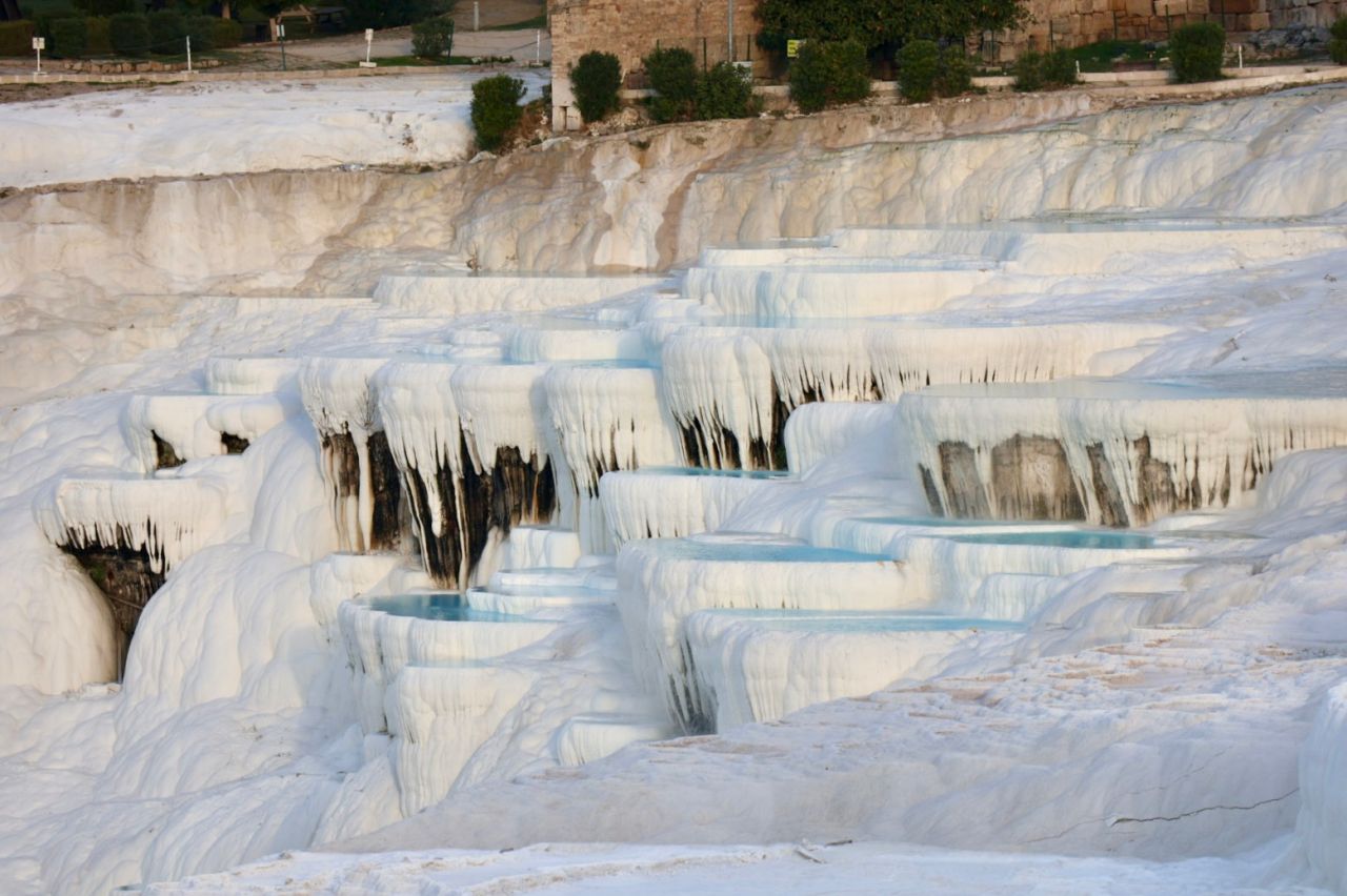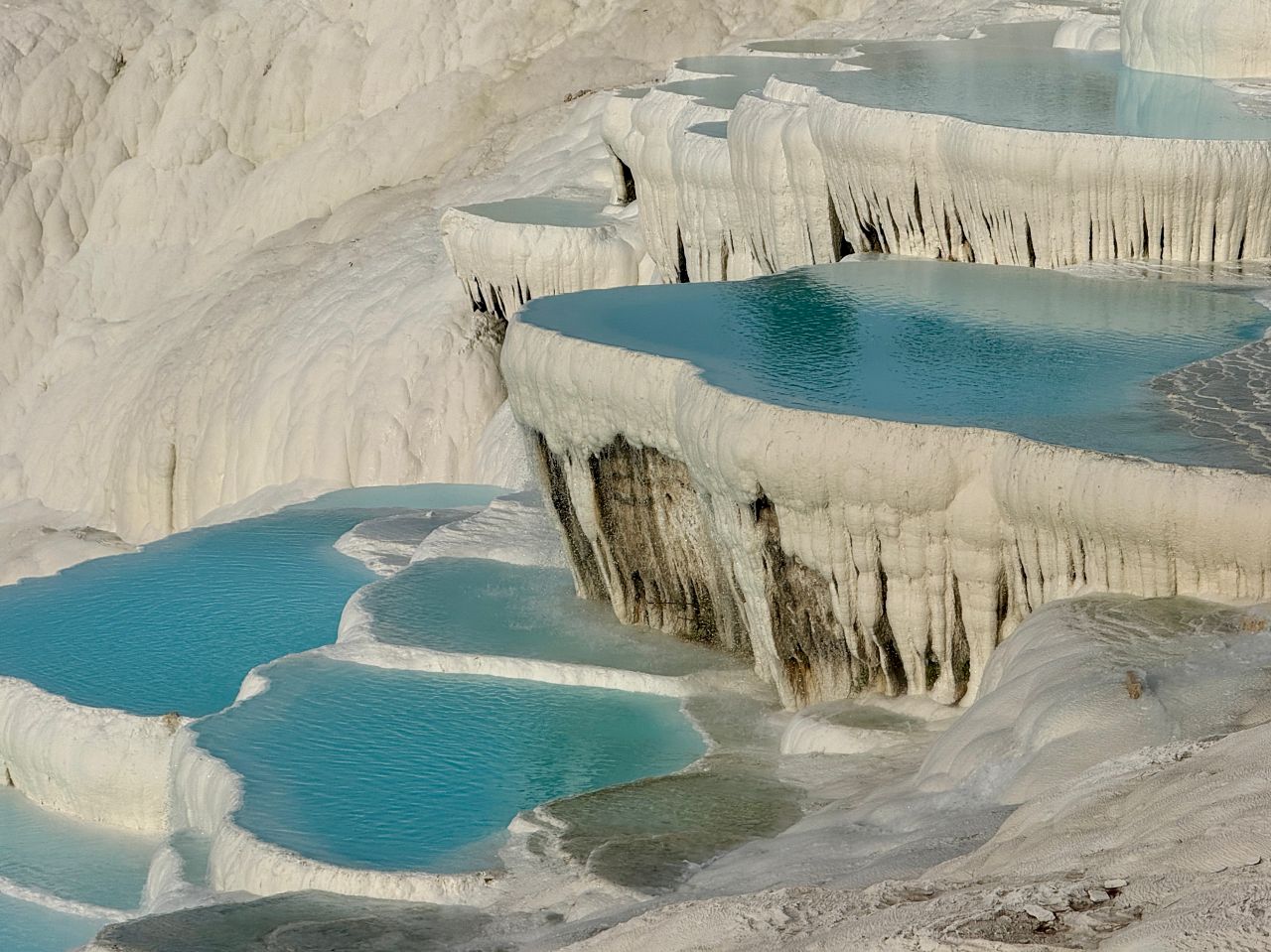 簡單來說,棉花堡的白色階梯是數千年來,從地底下不斷湧出富含鈣質的溫泉水,當這些溫泉水流經山坡時,會因冷卻和蒸發,將水中的碳酸鈣沉積下來。