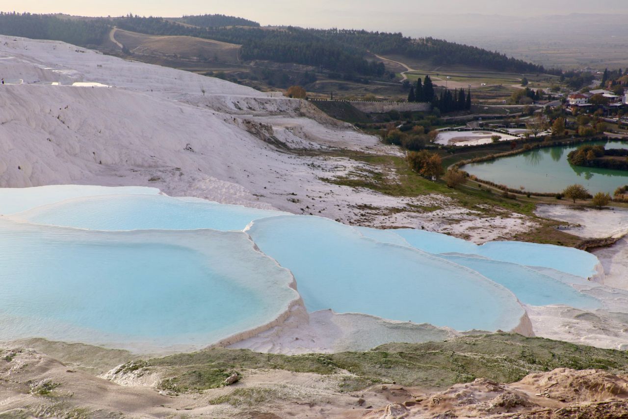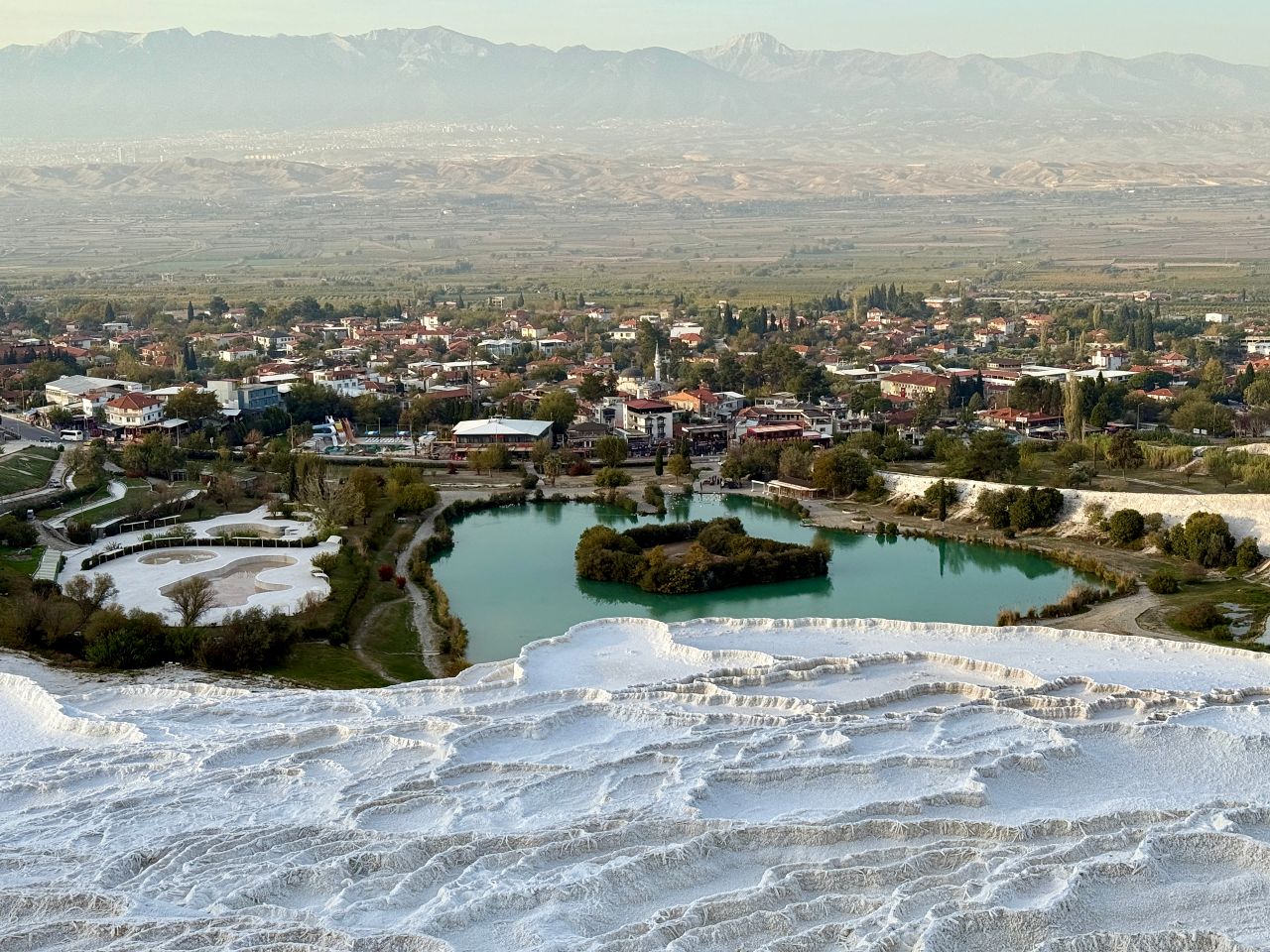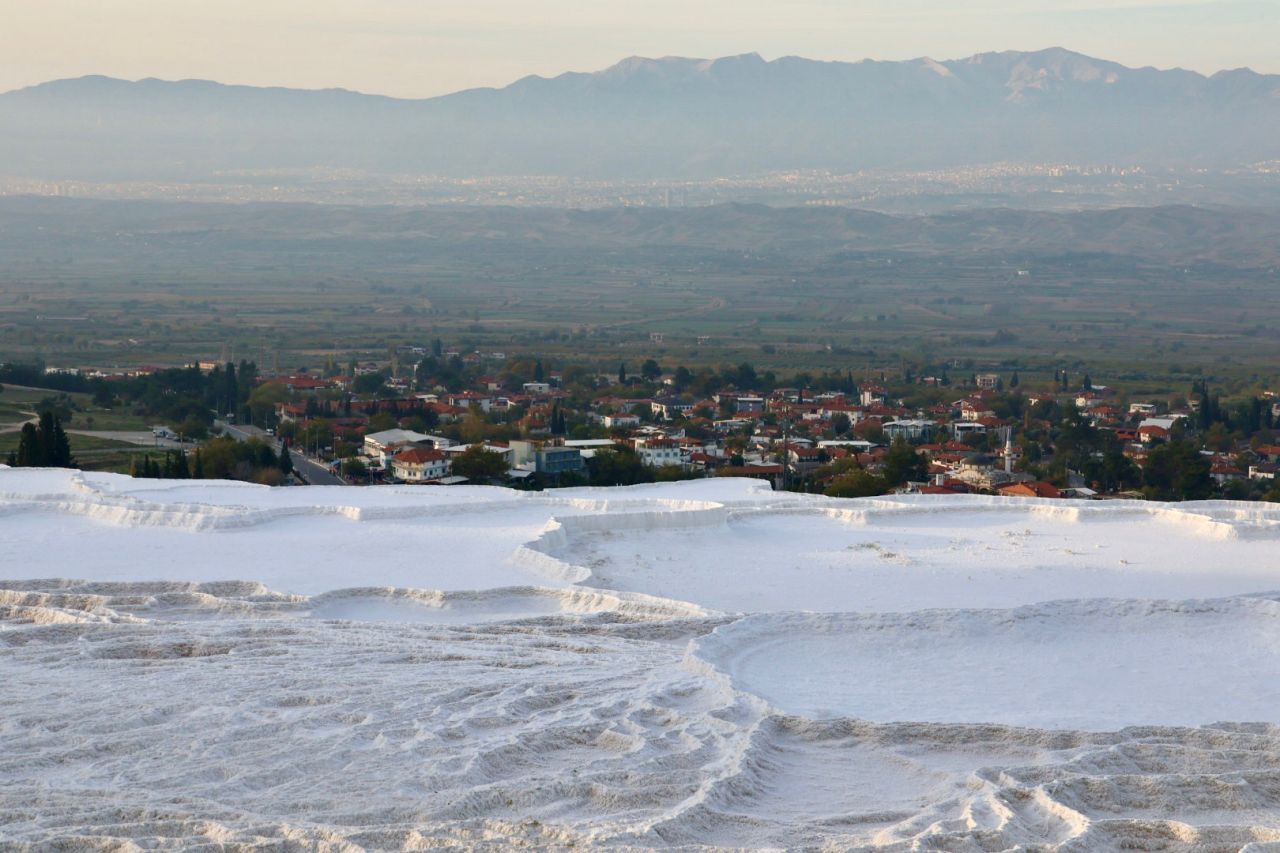 從棉花堡山頂望去,可以看見緊鄰山腳下的棉花堡小鎮 (Pamukkale Village)。