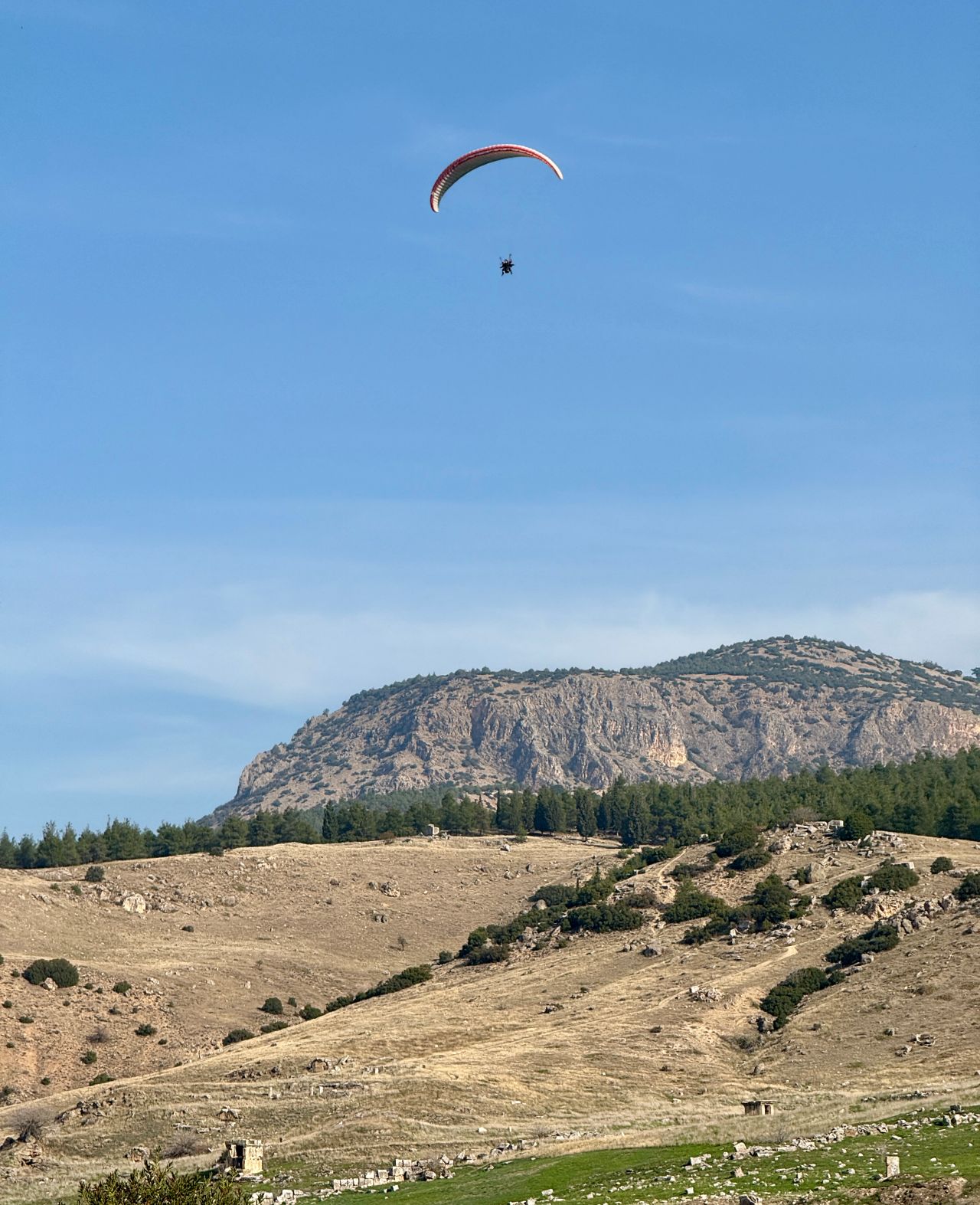 走在棉花堡的石灰華梯田或希拉波利斯古城遺址時,別忘了抬頭看看天空!沒錯,在棉花堡這裡是可以玩飛行傘 (Paragliding) 的。